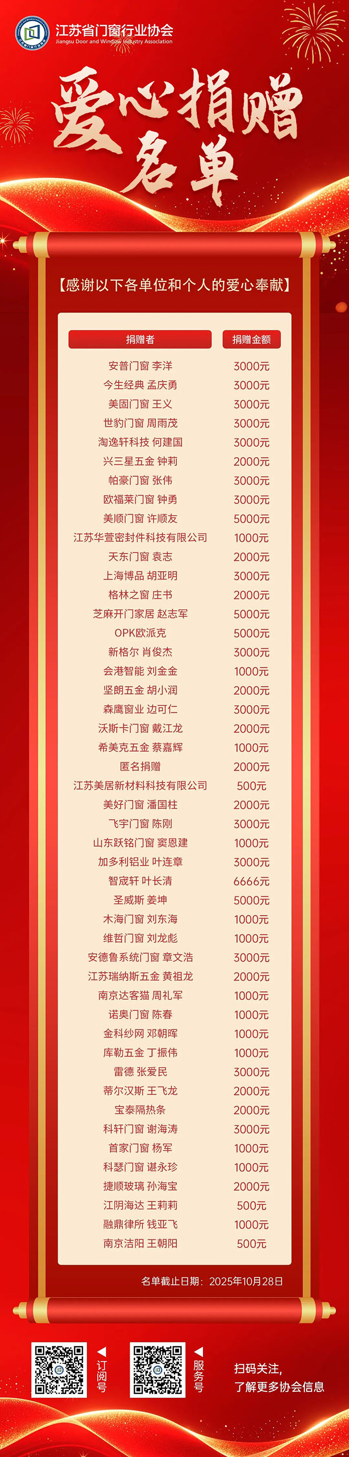 经江苏省门窗行业协会一届九次理事会决定,为了感谢捐赠人善举,协会会准备一份纪念相框和荣誉证书。爱心捐助工作所产生的物料采购、运输、网银手续费等相关附加费用支出,全部由协会承担,捐款人实际捐款金额全额按计划兑付捐助对象。