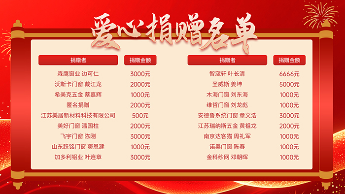 本次活动旨在积极履行社会责任,切实助力乡村发展与民生改善。在广大热心企业的大力支持下,协会于10月28日第十二届中国门窗行业大会期间,由爱心委员会主任委员赵志军(芝麻开门)、副主任委员刘婧婧(欧派克)、肖俊杰(新格尔)共同发起爱心倡议,号召行业同仁奉献爱心。这一倡议得到了众多富有社会责任感企业的积极响应,最终共募集善款108,173元。